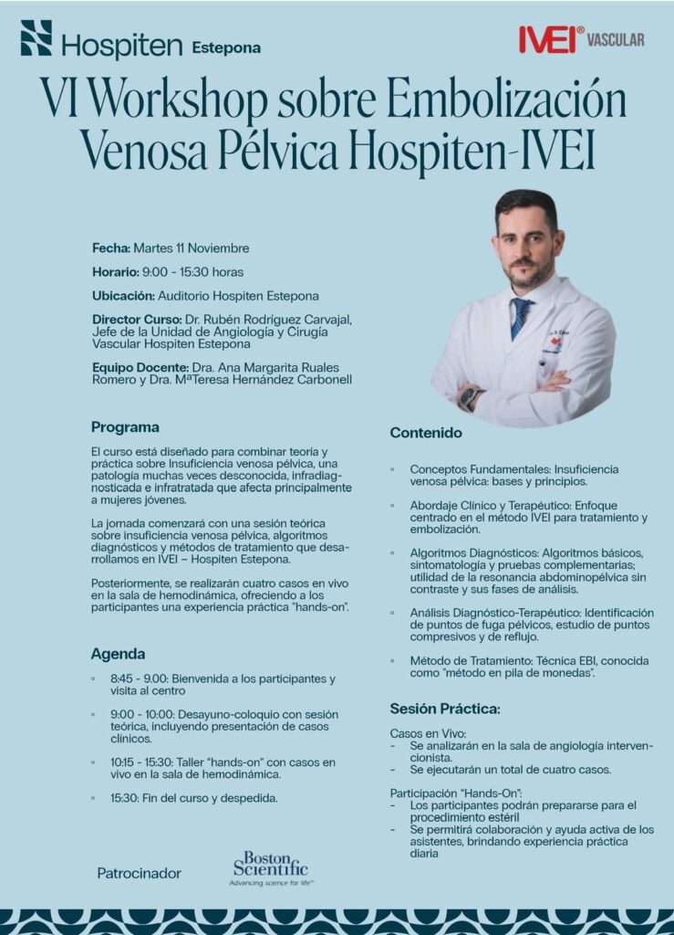 Hoy hemos concluido con enorme satisfacción el VI Workshop sobre Embolización Venosa Pélvica Hospiten–IVEI, una edición especialmente significativa por celebrarse en Hospiten Estepona, donde seguimos consolidando nuestra apuesta por la formación avanzada en patología venosa pélvica.